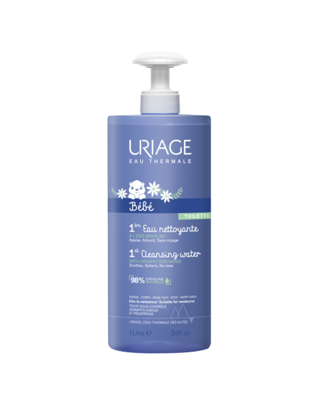 Thanks to a new complex [Uriage Thermal Water + Organic Edelweiss] the 1st cleansing water soothes, softens and protects baby’s delicate skin.